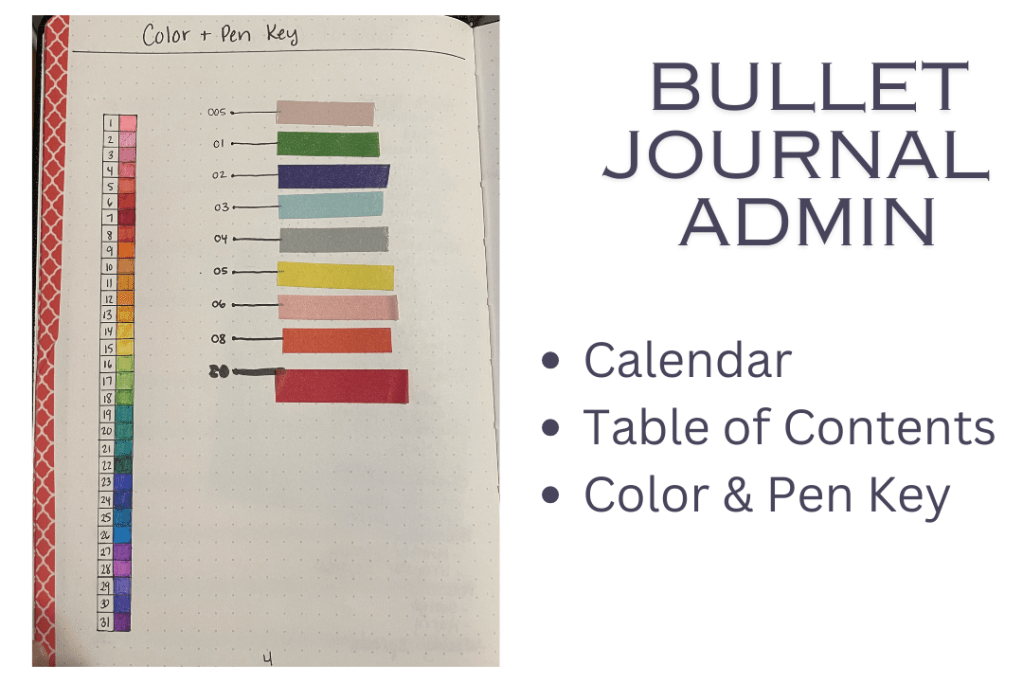 While this isn’t entirely necessary, it is fun. As I mentioned, I color code the day of the week with pens because I like how it looks over a year. So in the front of my journal I color in one square for each color in case I need to review, and the pens I use to write in the journal.