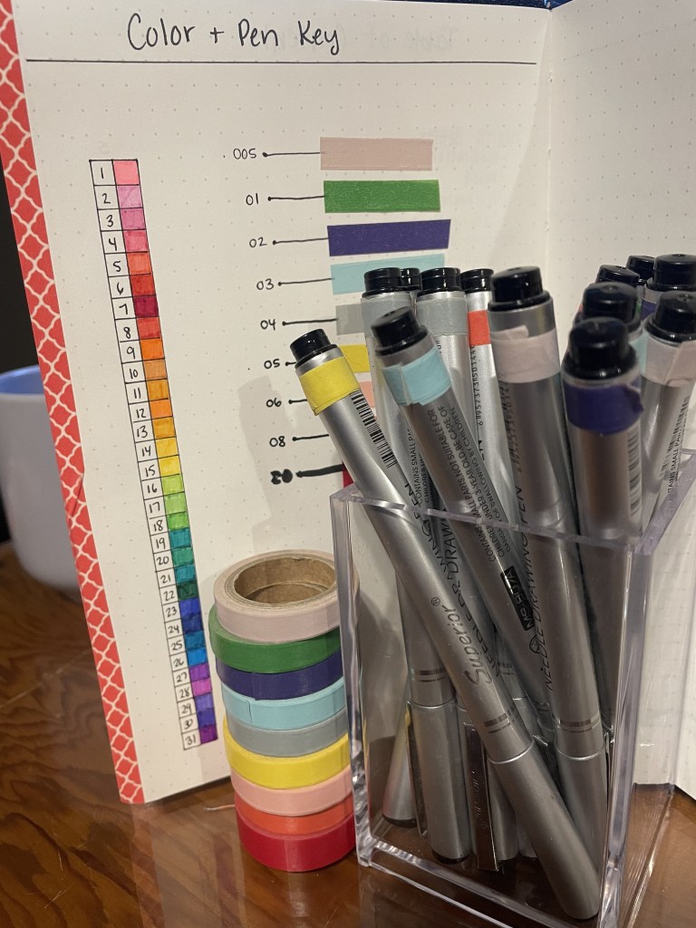 Black pens: I also use a set of black pens for everything from writing to making lines and designs. I really love these Micro pens but my single complaint is that the numbers on the cap wear off quickly. My solution was color coding them with solid washi tape so I can stay consistent in writing and creating spreads.