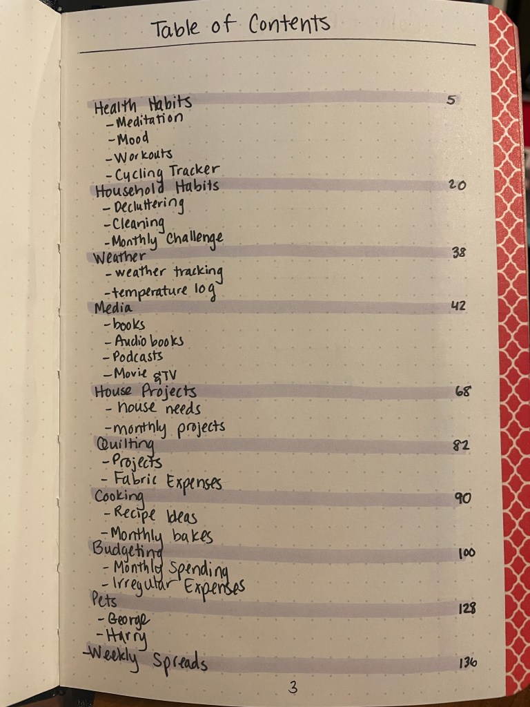 While I don’t turn to my Table of Contents daily, I will use flags on the pages I want to update every day or week. Since I have a lot more daily tracking pages in 2024 I will play around with this to see what works best for me. Most journals come with a fabric bookmark and I like to put that in the weekly spread for the week I am on.
