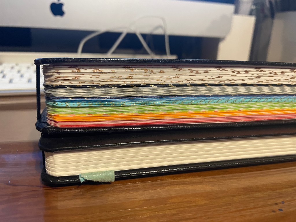 There’s one caveat I want to share with using washi tape on the edges of your pages: adding that much tape makes those page edges thicker. This is fine with me but if you want a sleek journal, maybe skip the tape or use it sparingly. Here is my 2019 (bottom) and 2024 (top) journal so you can see the difference. Same journal just designed differently.