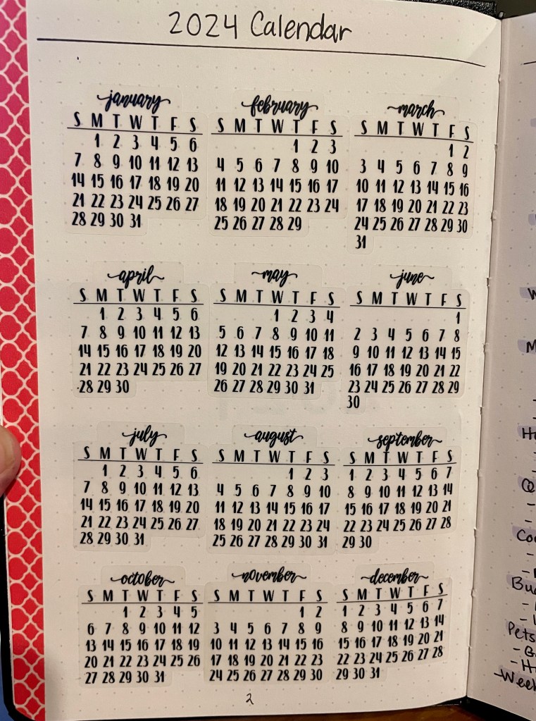 In the past I’ve written out the monthly calendars across 2 pages and… it was tedious. So instead I buy stickers on Etsy. Last year I had a great all-in-one sticker with the whole year, this year I got each month in its own sticker which, honestly, made it harder to align. But might be a good option if you want to put the calendars throughout the journal.