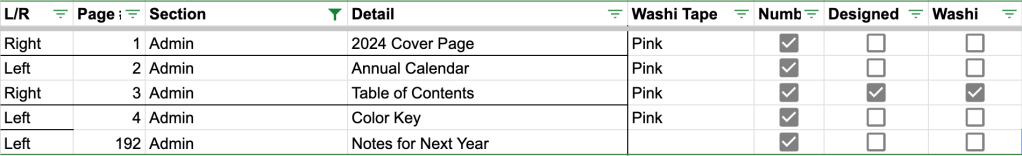 For 2024, I have 4 simple pages at the very front of my journal and a bonus page at the back: