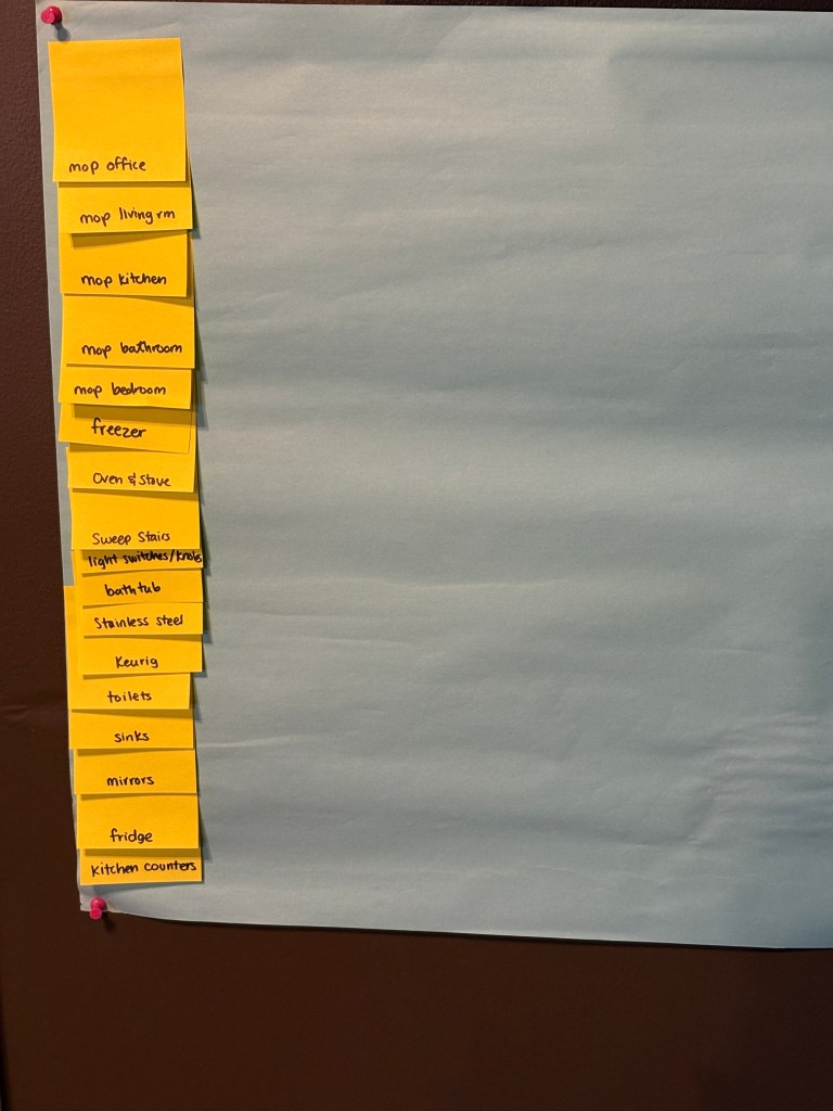 By writing the chore at the bottom of the sticky note, I can stack them like this and see every task easily. When a task is done, it moves to the right side of the giant Post-it. If I get halfway done, such as cleaning 2 of the sinks but not third, I allow it to hang out in the middle for a short time.