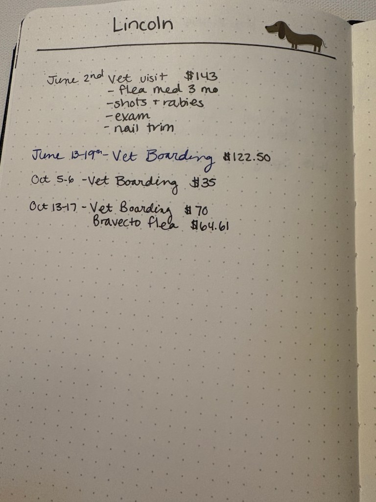 While I’m usually tracking medication and shots, next year I’ll be including the costs of food, toys and treats as well. Those are in the budgeting section of my journal since I have a couple cats and I’m not going to split the cost of litter and treats among the cats.